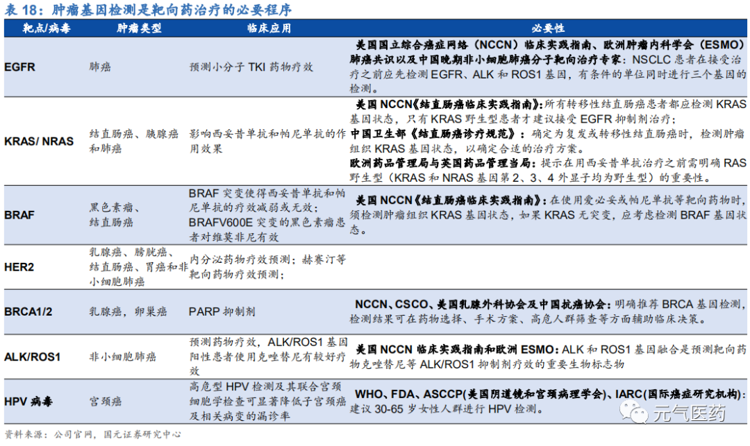 新靶点和新靶向药物的发现:从行业发展阶段来看,目前精准医疗仍处于发展早期,最为成熟的肺癌领域目前也在不断发展中,耐药机制也使突变位点不断增加,并出现 T790M、MET 等可成药的突变类型。此外,随着新药研发力度的增强,KRAS G12C、NTRK 等位点也正在被不断攻克中,伴随诊断产品也将不断丰富,市场有望进一步扩大;