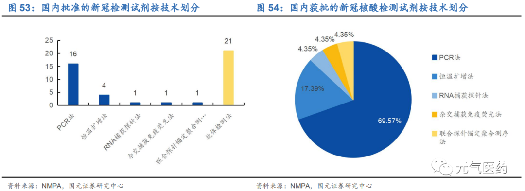 qPCR(荧光定量PCR)是目前应用最成熟、临床应用最广泛的技术平台。qPCR 在国内外均为分子诊断临床应用最 广泛的技术平台,尤其是在感染性疾病(病毒性肝炎、性病和其他病菌/病毒类等)和肿瘤伴随诊断领域,目前仍以 qPCR 技术平台为主。据不完全统计,截至 2020 年 5 月 11 日,国家药监局共批准了 806 个 PCR 类产品,其中荧光定量 PCR(qPCR)产品占比高达 85.11%。在伴随诊断领域,NMPA 获批的伴随诊断产品中有 60%都是基于 qPCR技术,而 FDA 批准的 39 个伴随诊断产品基于 qPCR 技术的产品占比也高达 38.46%(15 个)。