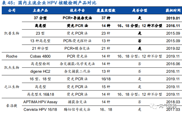 HPV 检测产品线丰富,渠道和品牌优势明显。目前国内获批的 HPV 检测产品近百种,涉及 49 家公司,市场竞争激烈,但市场集中度较低,凯普市占率约 1/3,罗氏和凯杰等进口品牌占 1/3,其余 47 家公司瓜分剩余 1/3 市场份额。 公司强大的市场竞争力主要由于公司检测产品线覆盖面广,满足市场各类需求,和其他厂商相比,具有获批时间早、覆盖亚型多、精准分型、检测时间短等优势。主要竞争对手中,罗氏和凯杰主要在 HPV16/18 分型检测产品上和公 司竞争,凯杰生物同时在 14 种不分型产品与公司竞争,公司除了上述产品外,还拥有 21 分型、37 分型等诸多产品, 在特定 HPV 检测要求下具有绝对优势。其中 HPV37 分型试剂盒是目前国内 HPV 分型最全面、可检测亚型最多的试剂盒,国内尚无竞争对手,适合临床诊断对全面、精准分型检测的高端需求;HPV21 分型试剂盒 2006 年就在国内获批,市场推广时间最长,先发优势明显。此外,作为国内最早涉足 HPV 检测市场的企业,公司具有明显的品牌优势,积累了深厚的渠道资源,保证了公司在 HPV 检测领域的领先优势。